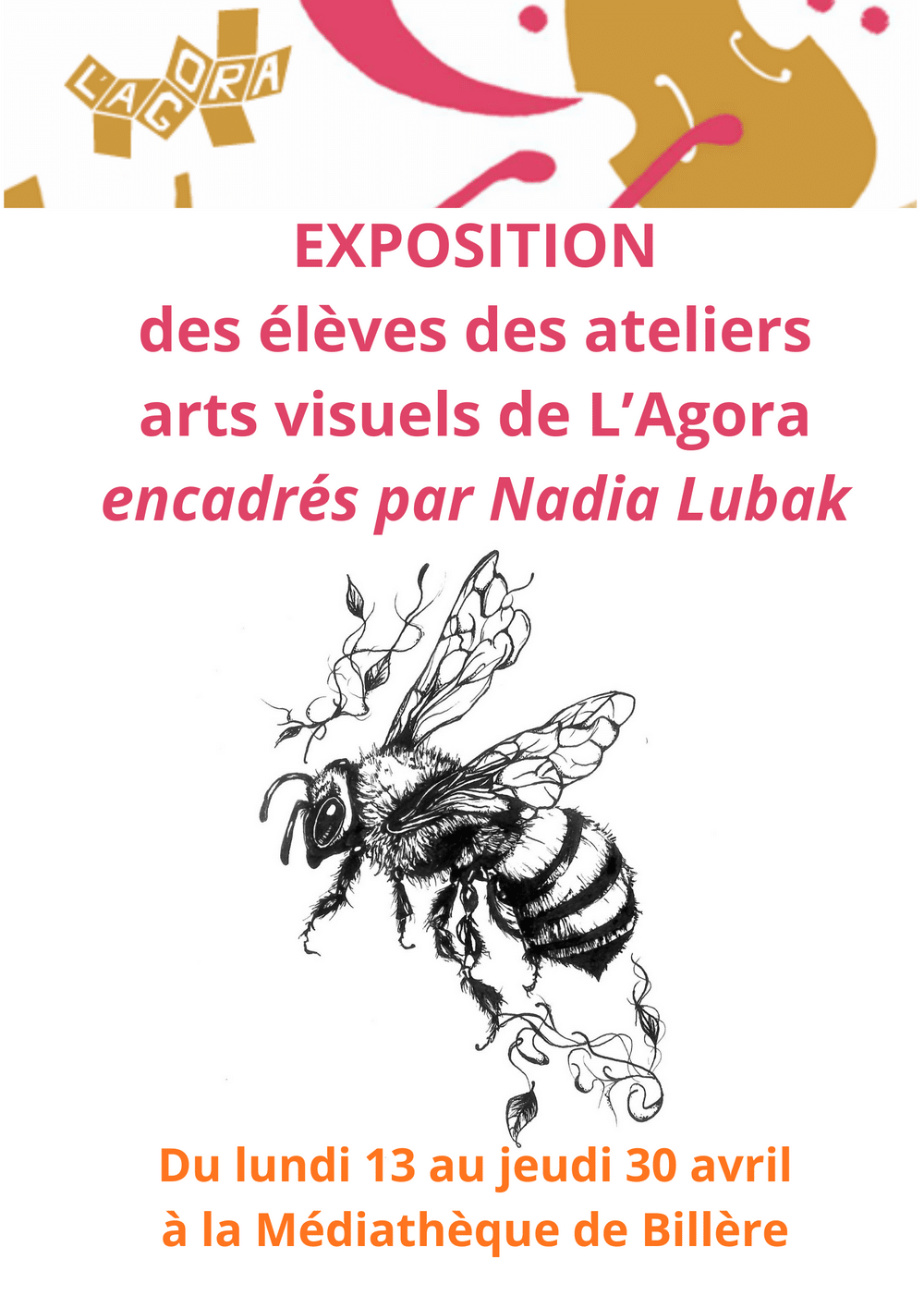 Du lundi 13 au jeudi 30 avril, les élèves des ateliers Arts Visuels de l’Agora encadrés par Nadia Lubak, exposeront à la médiathèque de Billère....