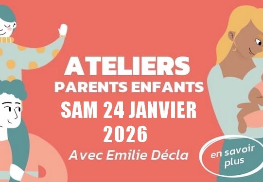 Atelier 3-18 mois → 9h30-10h30Atelier 18 mois-3 ans → 11h-12hAtelier 4-5 ans → 15h-16h 9€/binômeAvec Emilie Décla ...